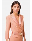 Combinaison complète de smoking croisé avec revers en satin. Le pantalon évasé du bas prolonge les lignes et sa taille serrée dessine une silhouette parfaite, enrichie d'une ceinture en satin duchesse avec boucle métallique.