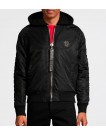 Jaqueta de Bombardeiro de Nylon de Philipp Plein. O casaco tem um capuz do tipo camisola que pode ser removido por meio de botões. Fecha-se com um fecho com a palavra PLEIN, tem um pequeno logótipo de Philipp Plein no peito. O colarinho, punhos de mangas e bainha são estriados. As costas são adornadas com um logótipo marcante do crânio bordado por Philip Plein. Dois bolsos à frente e um bolso interior com fecho éclair.